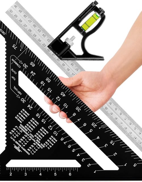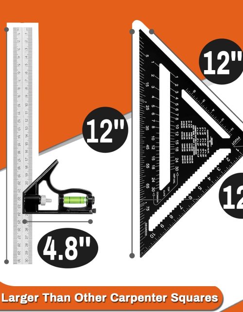 12″ Advanced Rafter Square and Combination Square Set, 12 Inch Imperial Carpenter Square Woodworking Framing Square, Triangle Protractor Layout Ruler Tool