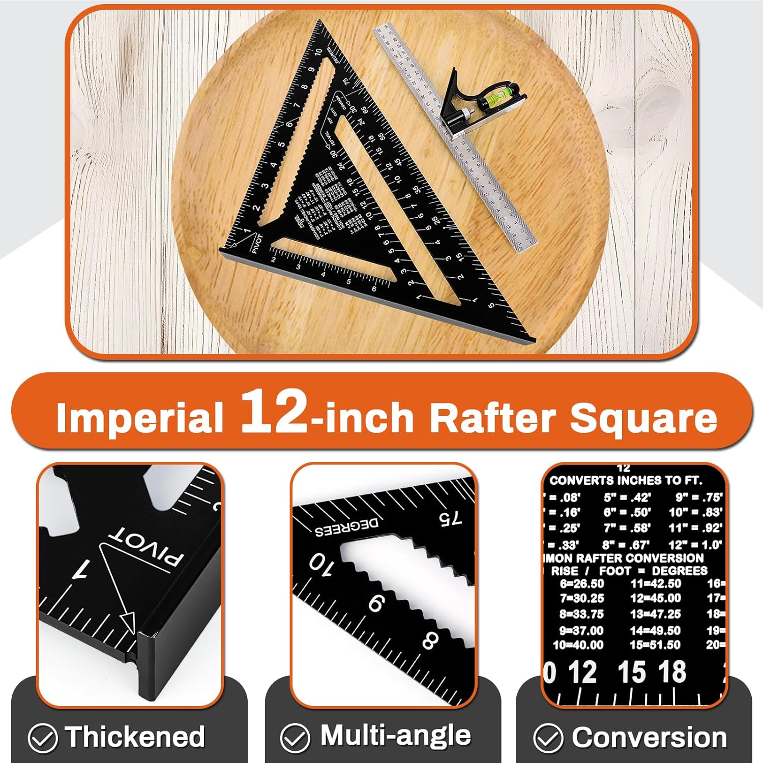 12″ Advanced Rafter Square and Combination Square Set, 12 Inch Imperial Carpenter Square Woodworking Framing Square, Triangle Protractor Layout Ruler Tool
